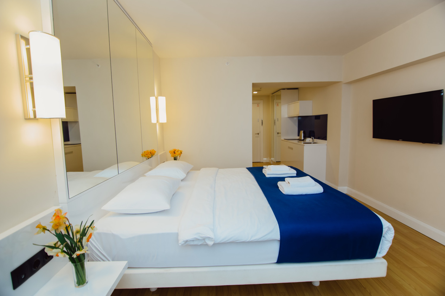 Наши стандартные номера для некурящих с балконом имеют вид на город, внутренний двор, оборудованы двуспальной кроватью размера King Size с ортопедическим матрасом. Оставайтесь на связи благодаря бесплатному Wi-Fi. Для вашего удобства во всех номерах есть оборудованная кухня со всем необходимым для комфортного проживания.